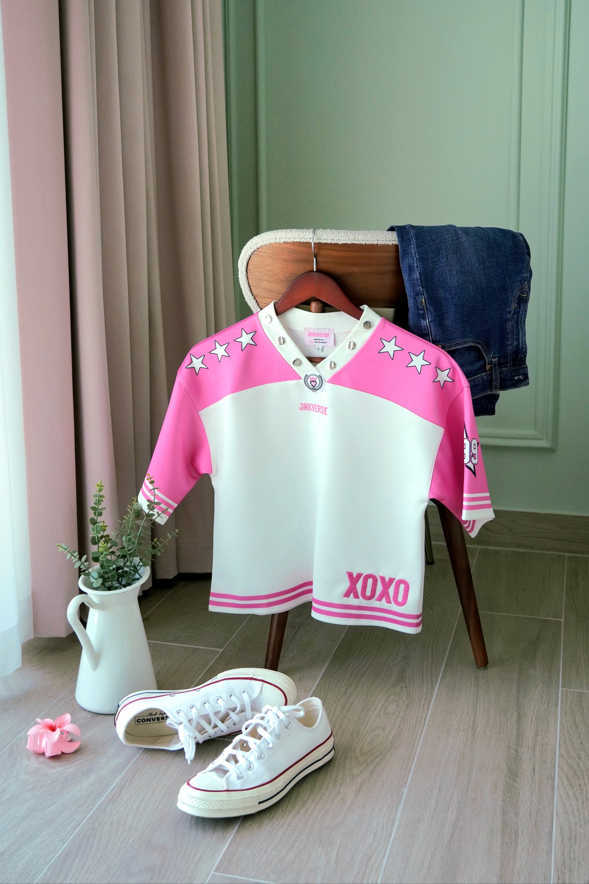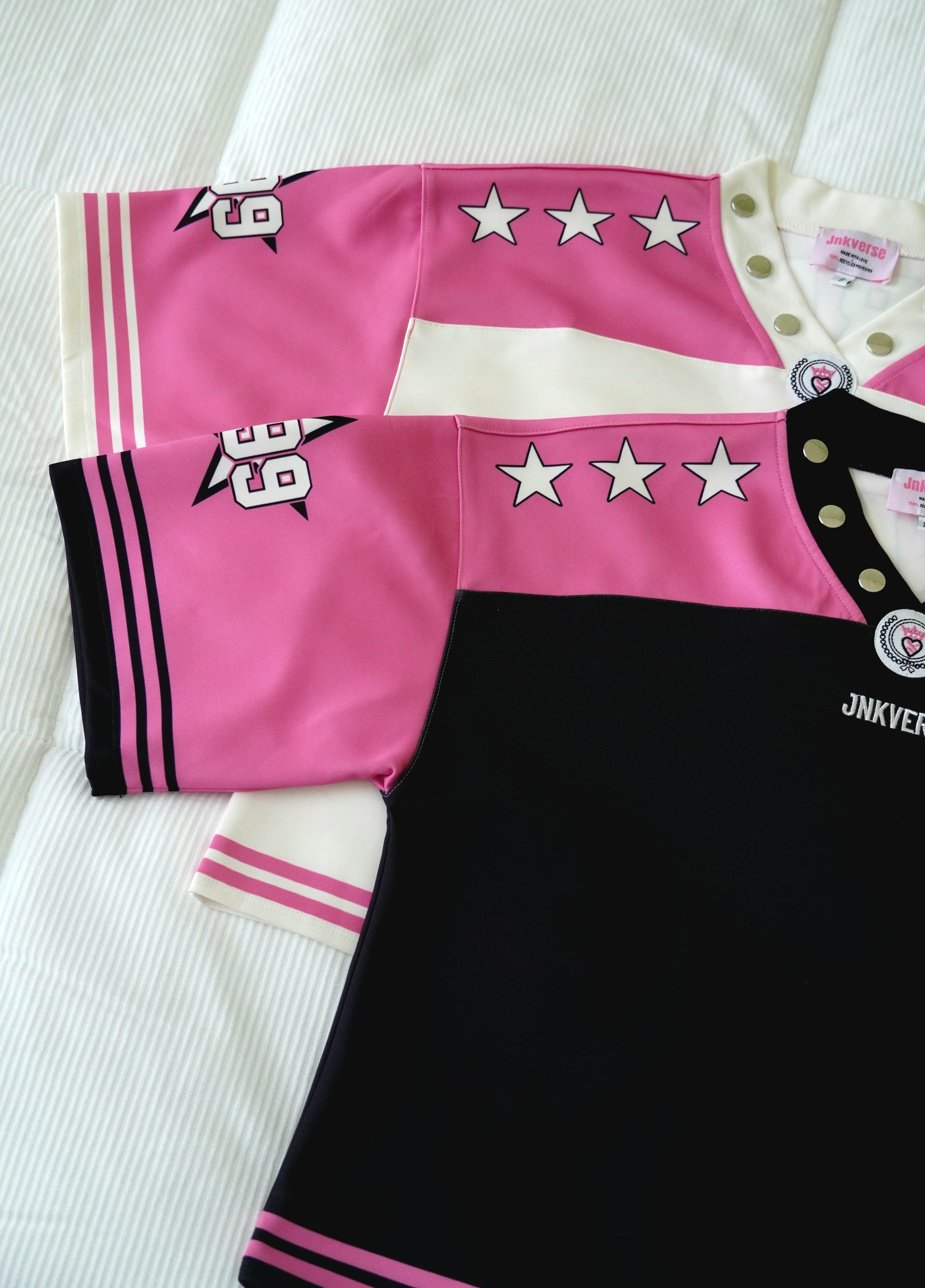 The Brat 101 Jersey fuses sport heritage with street sass: Two-tone panels, star print yoke, chunky numerals, and signature metal studs that hit the light just right.